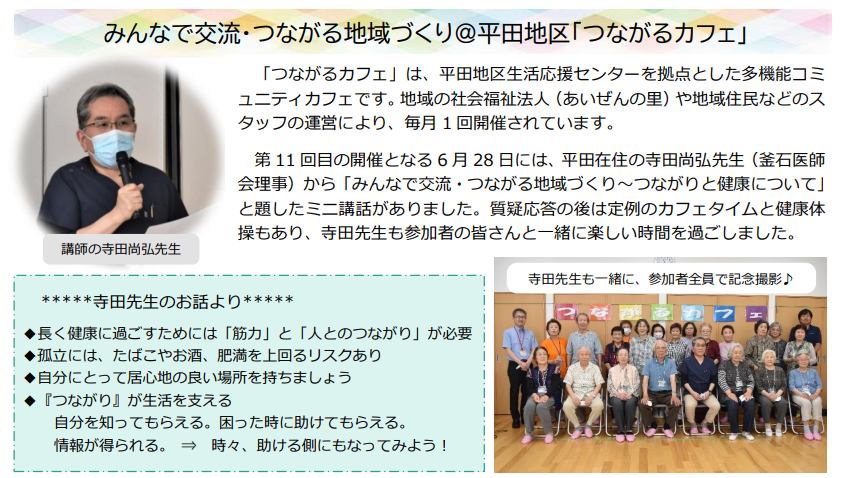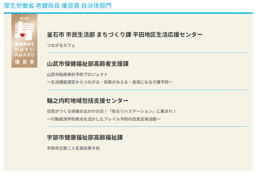 令和3年(2021年)より継続的に行われてきた「つながるカフェ」の取り組みが厚生労働省「健康日本21アクション支援システム ~健康づくりサポートネット~」の「第14回健康寿命をのばそう!アワード(介護予防・高齢者生活支援分野)自治体部門」を受賞しました!!